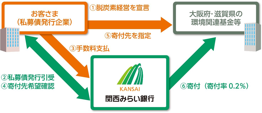 本商品は「脱炭素経営に取り組むことを宣言していただく」ことを利用条件とし、私募債発行の際にお客さまから関西みらい銀行が受け取る手数料の一部を、お客さまが指定した環境関連基金等に対して寄付を行い、再生可能エネルギー設備の普及、森林整備等の環境保全活動などを応援します。