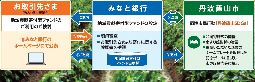 本ファンドは、その取組みにご賛同いただける法人・個人事業主を対象とした融資商品で、本ファンドの得る収益の一部を丹波篠山市に寄付する商品です(目標額:5億円、目標達成時寄付額:50万円)。