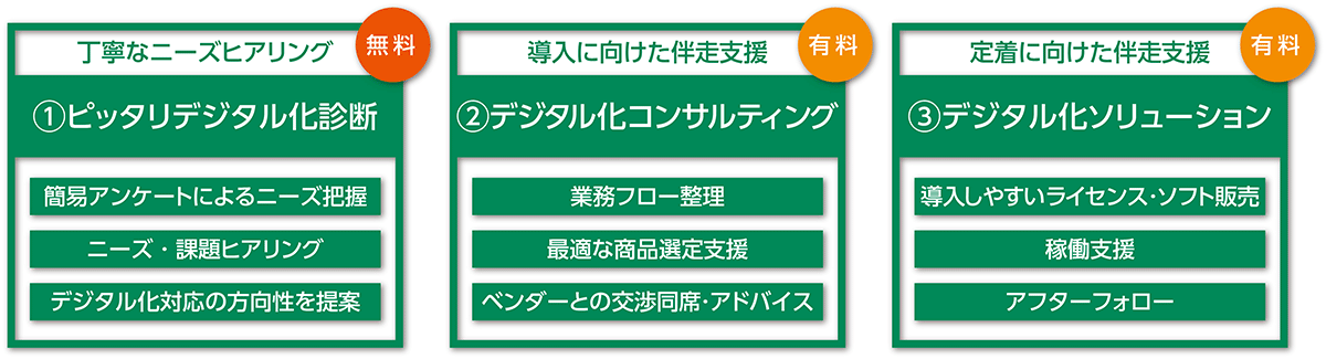 丁寧なニーズヒアリングからデジタル化に向けたコンサルティング、導入後のアフターフォローまで伴走型で支援を行い、それぞれのお客さまに最適なDX・デジタル化を支援します。また一部商品についてはMRPが販売代理店となり直接お客さまにご提供することで、より伴走的に支援を行います。