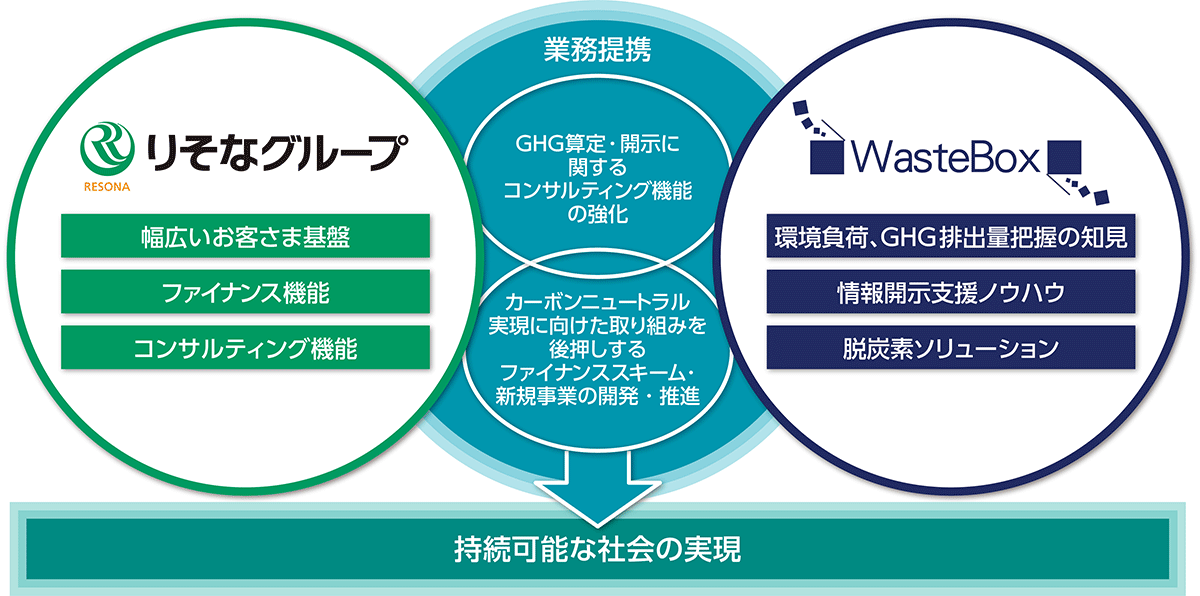 りそなグループとウェイストボックスは、これまでも協力して法人のお客さま向けのCO2排出量簡易算出サービス※1やサステナビリティ関連のコンサルティング等を提供してきました。今回の資本業務提携で、りそなグループの幅広い顧客基盤やネットワークと、ウェイストボックスのGHG※2に関する算定・開示等のノウハウ・知見の融合をさらに進め、法人のお客さまへのサステナビリティ分野におけるサービスを拡充し、持続可能な社会の実現に貢献してまいります。