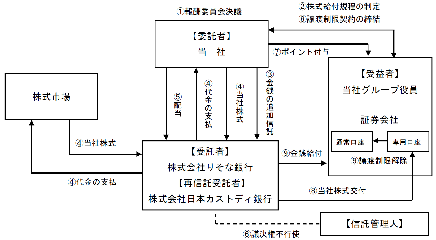 本制度は、当社グループ役員の報酬として、当社が金銭を拠出することにより設定する信託(以下、「本信託」といいます。)が当社の株式を取得し、予め定める株式給付規程(以下、「株式給付規程」といいます。)に基づき、上記評価指標を踏まえて①当社グループ役員に付与するポイントの数に相当する数の当社株式(以下、「当社株式」といいます。)及び②ポイントの数に応じて算定される当社株式の時価に相当する金銭(以下、「当社株式」と併せて「当社株式等」といいます。)を、本信託を通じて、当社グループ役員に交付及び給付(以下、当社株式の交付と当社株式の時価に相当する金銭の給付を併せて「当社株式等の給付」といいます。)する株式報酬制度です。