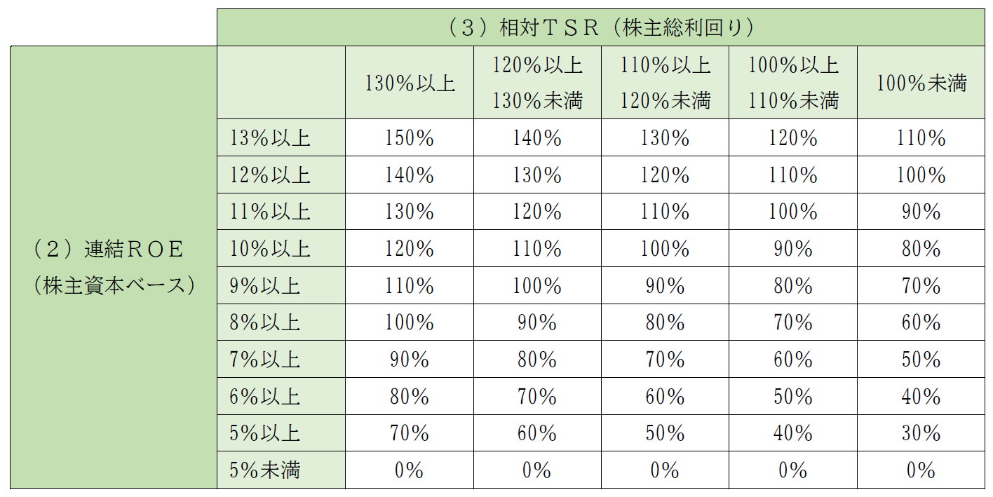中期経営計画の最終事業年度である2023年3月期の(2)連結ROE(株主資本ベース)及び(3)相対TSR (株主総利回り)の数値に応じて定まる下表の値を業績連動係数とします。