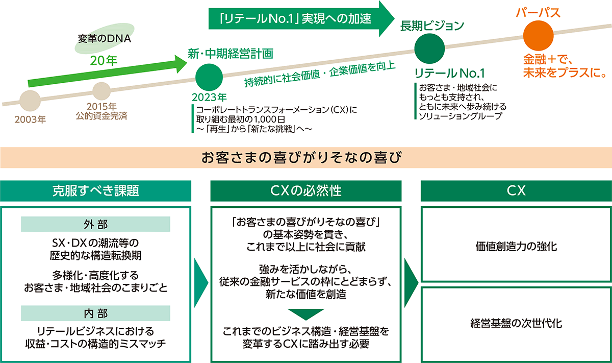 - CXに向けて、多様化・高度化するお客さま・地域社会のこまりごとに応えるための「価値創造力の強化」と、自らが変化に適応しながら、多様な価値創造・提供を可能にする「経営基盤の次世代化」に取り組みます。
