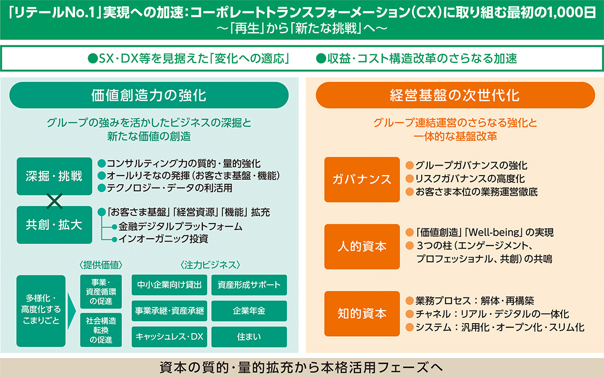 「リテールNo.1実現への加速に向けてCXに取り組む最初の1,000日」と位置づける本計画では、SX・DXの潮流等を見据えた「変化への適応」および「収益・コスト構造改革のさらなる加速」を図るべく、「価値創造力の強化」「経営基盤の次世代化」に取り組んでまいります。