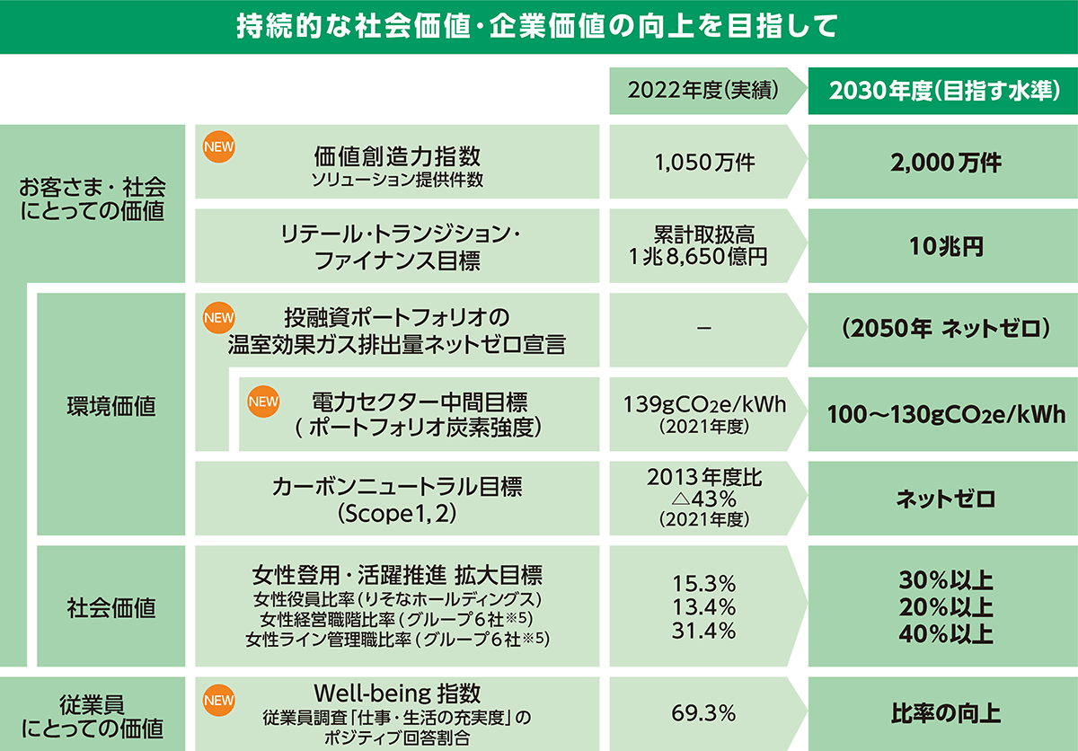 - 持続的な社会価値・企業価値向上への取り組みを加速させるべく、2030年度の達成を目指す指標を設定いたしました。