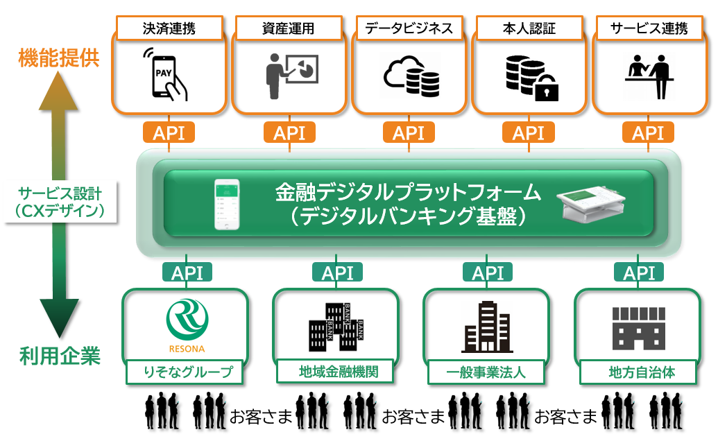 りそなグループは機能の提供側と利用者側をつなげるエコシステムを構築し、りそなグループのお客さまだけでなく、地域金融機関や一般事業法人、地方公共団体等やその先のお客さまに向けて、金融デジタルプラットフォームを提供します。