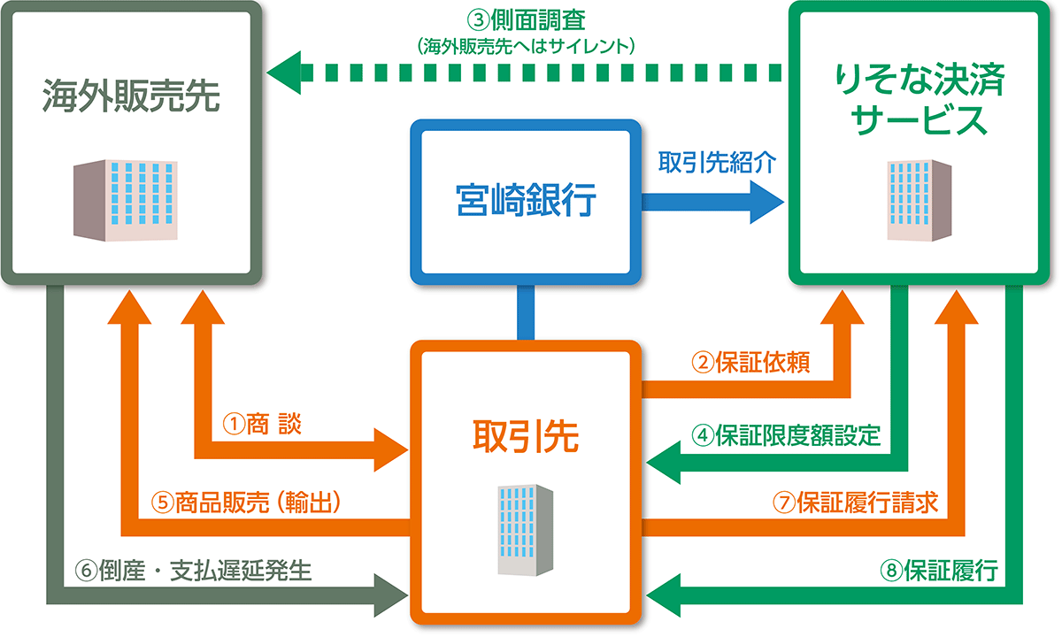 りそなグループと取引がないお客さまでも宮崎銀行の紹介を通じて輸出債権保証を利用でき、海外債権の回収リスクをヘッジすることや与信管理のアウトソーシングも可能となります。お客さまの利便性向上だけでなく、新たな収益機会を模索する地域金融機関にとっても収益の多角化につながります。