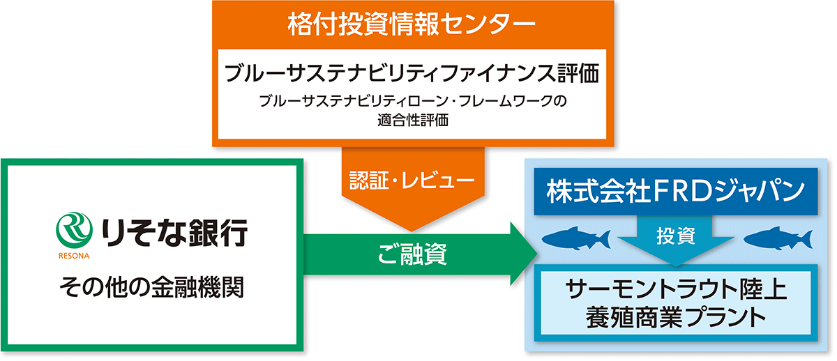 FRDジャパンは、サーモントラウトを養殖・販売する企業です。本契約に基づく資金は、2023年7月に千葉県富津市において着工するサーモントラウトの陸上養殖商業プラントの 建設資金に充当される予定です。天然海水を使用せずに飼育水を閉鎖循環させながら水質を維持できるプラントで、場所を選ばずに消費地近郊で養殖を行うことが可能となります。本融資を通じて、 高鮮度な商品を低い輸送コストで流通させる仕組みの実現をサポートします。
