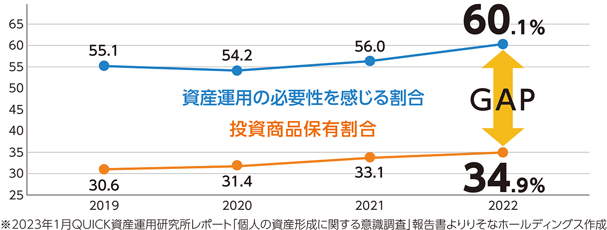 世の中で資産運用の必要性を感じている方の割合は6割なのに対し、投資商品を保有している方の割合は3割程度に留まっています。 つみたてボックスは、こうした方々へのはじめの一歩をサポートするツールとして、多くの方に一番身近なスマホに新機能を搭載しました。