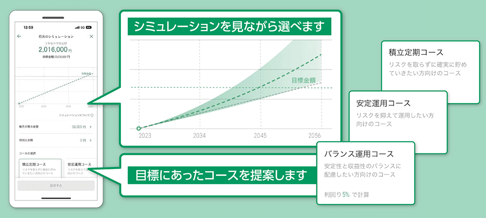 立てた目標から逆算してつみたて方法をアプリが提案、購入までできる業界初の仕組み