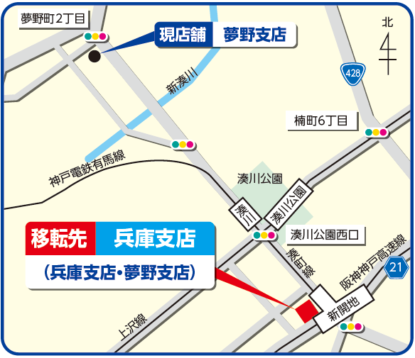 関西みらいフィナンシャルグループのみなと銀行(社長 武市 寿一)は、2024年2月13日(火)夢野支店を兵庫支店内に、2024年2月19日(月)谷上支店を神戸北町支店内に移転し、それぞれ同じ店舗内で共同営業しますので、お知らせいたします。今回の夢野支店と谷上支店の移転では、店名・店番号・口座番号の変更はございませんので、現在お持ちのカード・通帳・証書は、移転後もそのまま継続しご利用いただけます。
