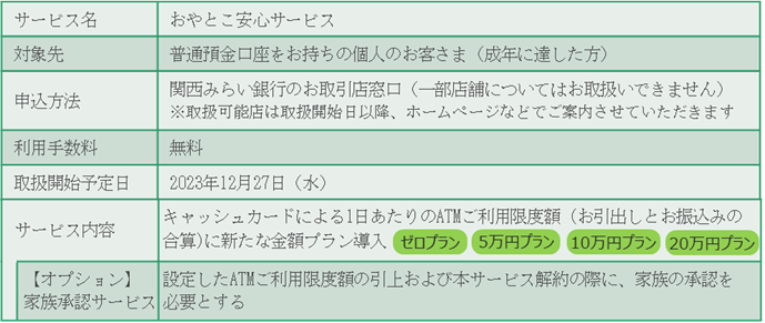 関西みらいフィナンシャルグループの関西みらい銀行(社長 西山 和宏)は、社会的に深刻な問題となっている還付金詐欺などの特殊詐欺被害に対し、お客さまに安心してお取引いただけるよう、被害拡大を防ぐ対策として、2023年12月27日(水)より『おやとこ安心サービス』(以下、本サービス)の取扱を開始します。