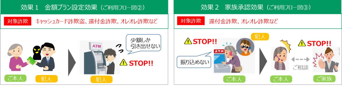 被害の未然防止には、身近な方からのお声掛けや対話が大切です。本サービスでは、事前に設定したATMご利用限度額の引上・解約をご本人が希望される際に、家族の承認が必要になる「家族承認サービス」を付帯可能としました。これによりご家族との対話の機会が生まれ、詐欺被害の早期発見につながると考えました。
