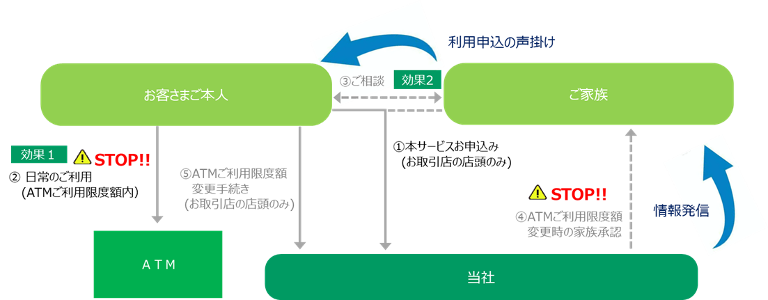 本サービスはキャッシュカードによる現金のお引出し・お振込みの1日あたりのATMご利用限度額を予め制限するサービス※2で、ご利用限度額を変更(引上・解約)する場合にご家族の承認を条件とする事ができる、これまでありそうでなかった無料のサービスです。