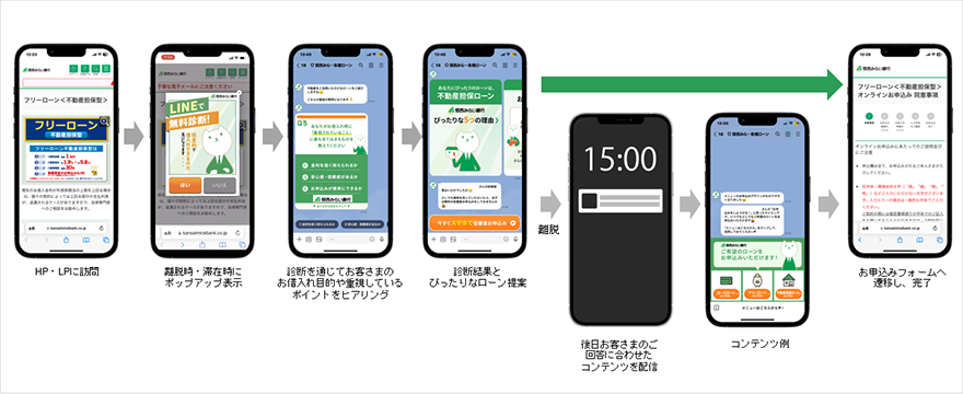ローン商品に関心をもち、当社のホームページや商品案内ページをご覧になったお客さまにポップアップでLINEの友だち追加をご案内し、LINE上で「診断ツール」によりお客さまのご希望に合った商品を案内します。これまで消費性ローンのご相談は、窓口のほかコールセンターなどでの営業時間内の対応に限られていました。今回のZEALS社のチャットコマース®導入により、24時間いつでも、チャットボットが自動でコミュニケーションを行ないます。