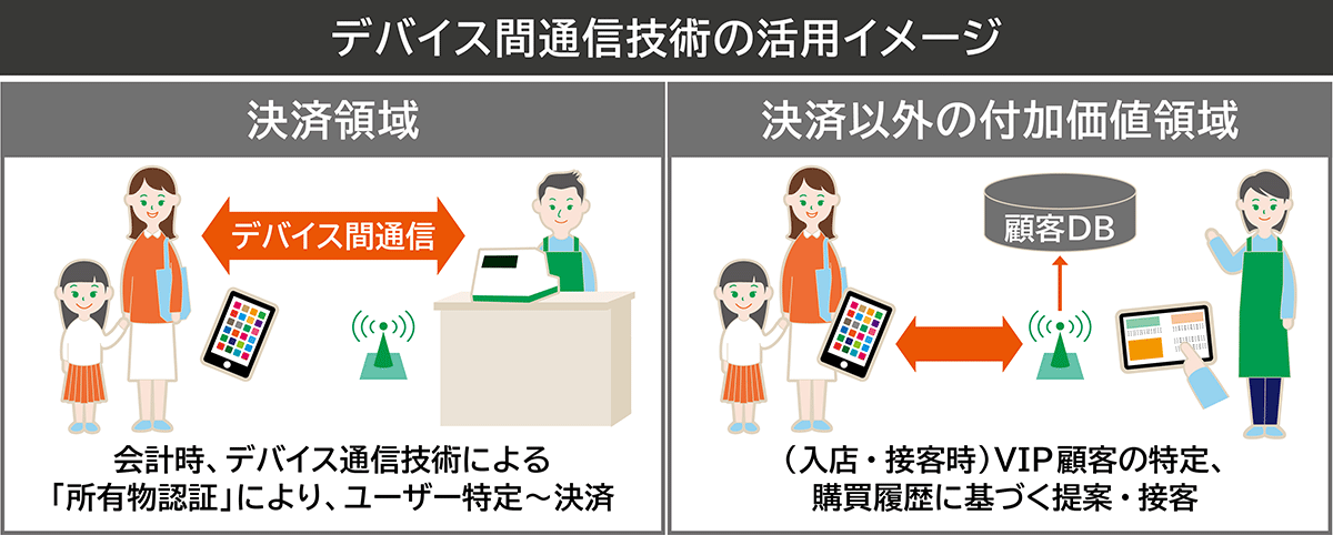 BLE(Bluetooth Low Energy)やUWB(Ultra Wide Band)等の通信技術を用いて、来店したお客さまが持っているスマートフォンと、店舗に設置された決済端末や各種IoTデバイスとの連携により、お客さまがスマートフォンの取り出しや画面起動といった操作を行わず、決済手続きが完了できるものです。バッグやポケットにスマホを入れたままでも、認証から決済手続き完了まで行う新たな決済体験を構築していきます。