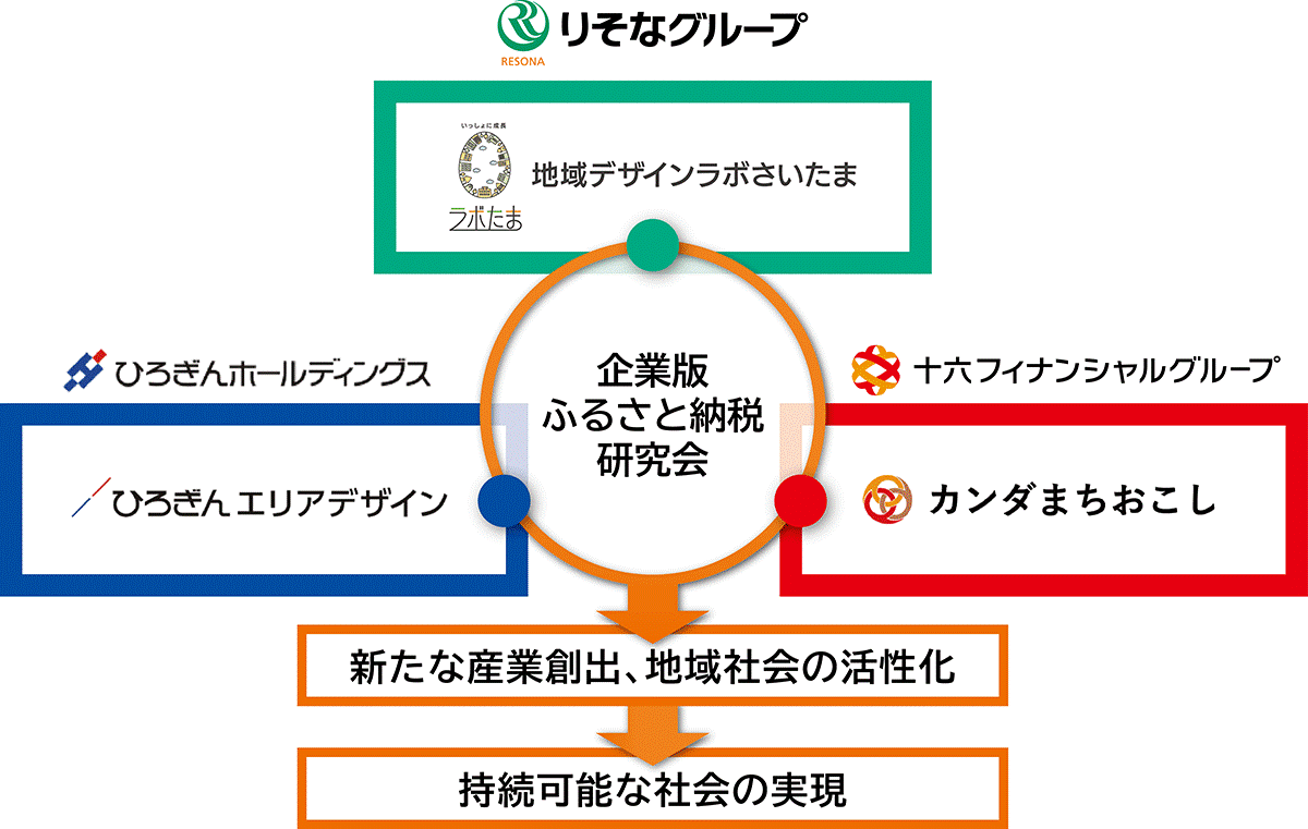 りそなグループの地域デザインラボさいたま(埼玉県さいたま市 社長 園田 孝文)は、十六フィナンシャルグループ子会社のカンダまちおこし(岐阜県岐阜市 社長 田代 達生)とひろぎんホールディングス子会社のひろぎんエリアデザイン(広島県広島市 社長 松内 紀子)との間で本日、企業版ふるさと納税のさらなる発展を目指し「企業版ふるさと納税研究会」を設立しました。
