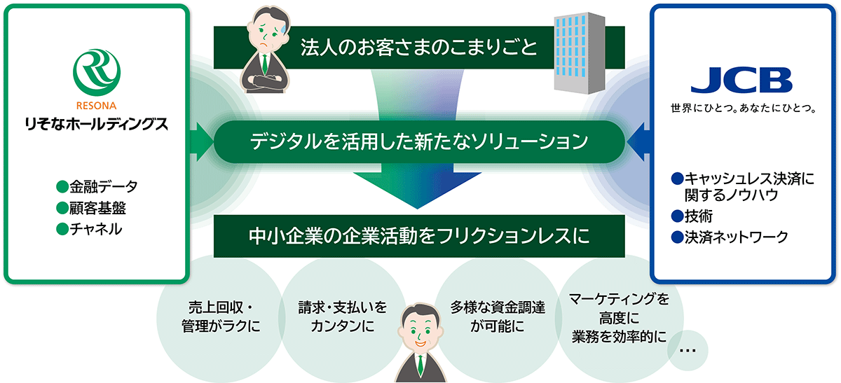 りそなグループが持つ金融データ・顧客基盤・チャネルとJCBが持つキャッシュレス決済に関するノウハウ・技術・決済ネットワークを掛け合わせて、決済を起点とした法人分野における新たなソリューションを共同で検討・開発し、中小企業のお客さまの生産性の向上に貢献します。