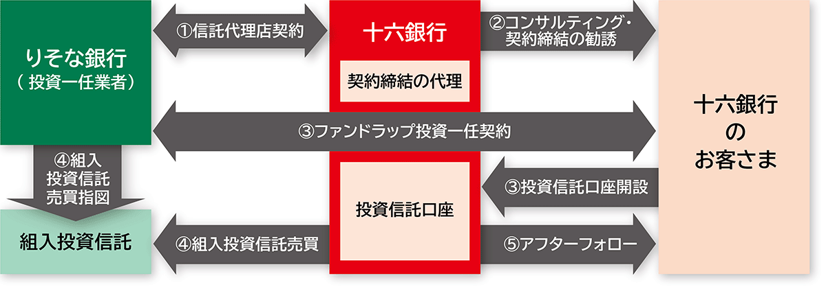 十六銀行が信託代理店となり、りそな銀行のファンドラップを取り扱います。十六銀行のお客さまは、十六銀行に開設したご自身の投資信託口座を通じて、長期分散投資ならびに資産管理サービス機能を持つファンドラップをご利用いただけます。