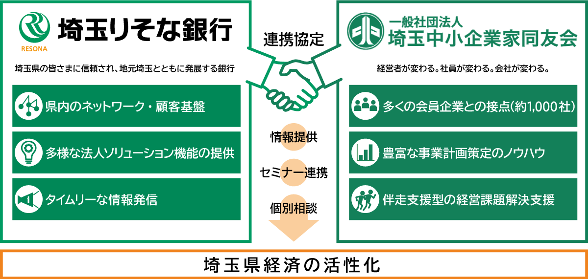 生産年齢人口の減少による人手不足や経営者の高齢化による後継者問題等、中小企業は持続可能な経営をするうえで様々な課題を抱えています。本連携協定により埼玉りそな銀行は、埼玉中小企業家同友会の会員企業に向けた人財や事業承継に関するソリューション等の提供や、埼玉中小企業家同友会による研修を通じて得た事業計画策定に関する知見等をお客さまに提供することで、県内企業の経営をサポートします。