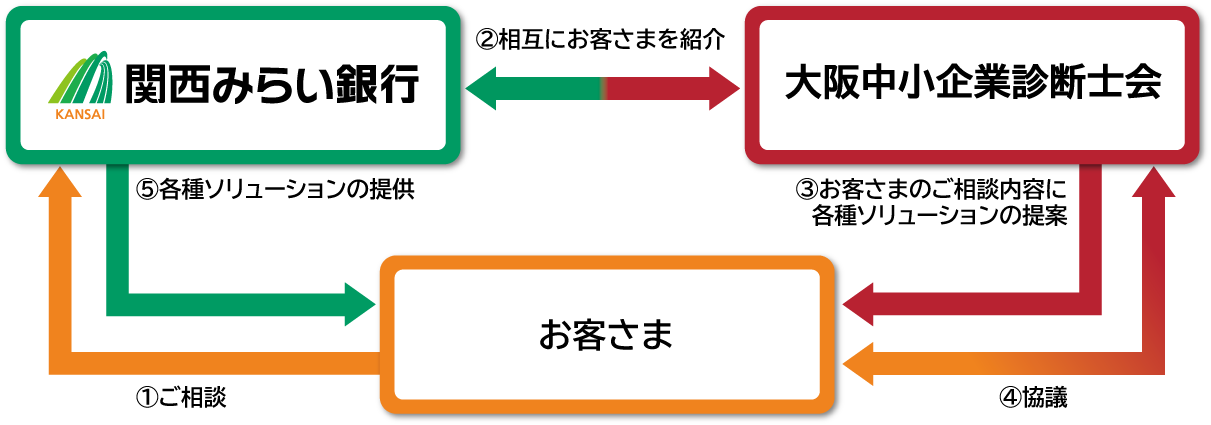 約400名の中小企業診断士が所属するコンサルファームである大阪中小企業診断士会と連携し、経営改善計画策定の支援やお客さま向けの経営に関するセミナーの開催などに取り組みます。これまで以上にお客さまの経営課題の解決に注力し、地域経済の発展に貢献していきます。