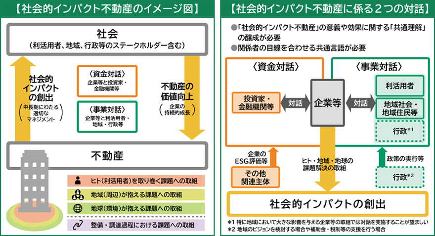 - ※2企業等の社会課題への取り組みを後押しするとともに、投資家や金融機関等の投資につながるよう、国内外の動向を踏まえつつ、不動産の特性を考慮したうえで社会課題に貢献・対応するに当たっての基本的考え方や不動産分野の社会課題・取り組み・「社会的インパクト」の評価方法等を整理したもの。