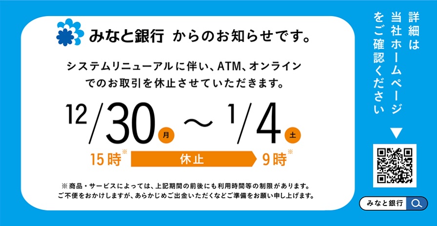 12月30日(月)15時から1月4日(土)9時にかけてATM、オンラインでのお取引を休止します。ご不便をお掛けしますが、あらかじめ現金をご出金いただくなどご準備をお願い申し上げます。