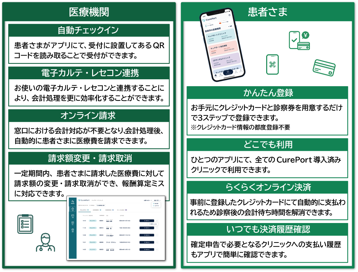 CurePortは、患者さまが事前に登録したクレジットカードで医療費を自動決済できるサービスです。患者さまの診察後の待ち時間を短縮できるとともに、医療機関にとっては、診察当日の受付から会計業務までを全てオンラインで管理できるため、会計手続きの効率化に繋がります。