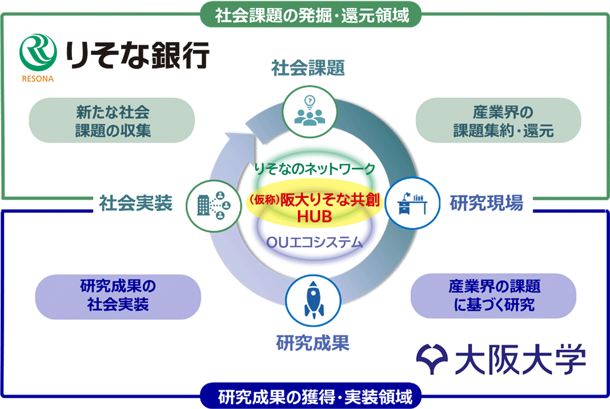 「よりよい未来社会の創造」及び「地域社会の発展」の実現に向け、世界をリードする研究力及びイノベーション創出の強固な基盤を誇る大阪大学と、広範なネットワークを有するりそな銀行が互いの強みを融合させ、新たな価値創造による社会課題解決を目指した共同研究等の組成や大阪大学発スタートアップの創出・育成に取り組みます。