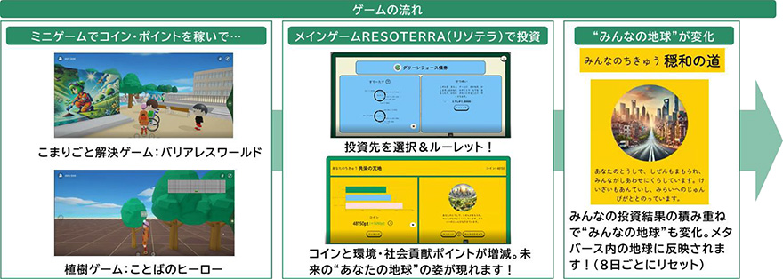プレイヤーは仮想の地球を舞台に、資金管理や投資の基本を学びながら株式や債券などへの投資を行い、個人資産の増減や2050年の地球の姿がどうなるかなどの体験を通じて、金融の持つ力を体感することができます。