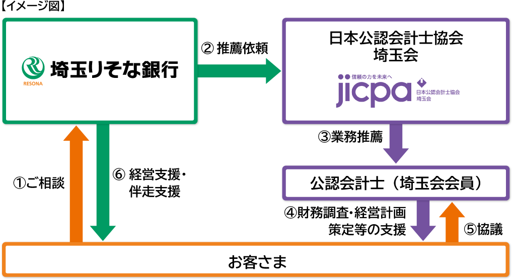日本公認会計士協会埼玉会は全国16の地域会の一つで1,000名超の公認会計士が所属しています。多種多様な支援経験や専門性をもつ日本公認会計士協会埼玉会と連携することで原材料の高騰や人手不足等を背景に複雑化・高度化するお客さまのこまりごとを解決します。創業期・成長期・成熟期・衰退期の各ライフサイクルにおける財務調査や経営計画の策定、お客さま向けの経営に関するセミナーの開催、当社従業員向け研修による課題解決力の向上等を通じて地域経済の活性化を目指します。
