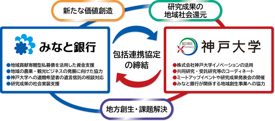 兵庫県内に広域高密度のネットワークを有するみなと銀行と、幅広い分野で高い研究力を有する神戸大学が連携し、研究成果を地域に還元することで地域経済の発展と地域にかかわる方々が安心して暮らせる社会を実現します。