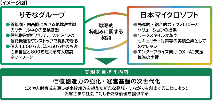 りそなホールディングスは、日本マイクロソフトのMicrosoft 365※1や生成AI分析基盤などの製品・サービスの提供を受け、同社と連携してきました。今回の戦略的枠組みに関する契約により、りそなグループは「リテールNo.1実現への加速」に向けて、日本マイクロソフトのAIなどの先進的なテクノロジーを活用し、価値創造力の強化と経営基盤の次世代化を目指します。