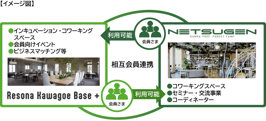 りそなグループの地域デザインラボさいたま(社長 園田 孝文)は、運営する「りそな コエドテラス(以下「コエドテラス」)」のインキュベーション施設「Resona Kawagoe Base+」と群馬県のコワーキングスペース「NETSUGEN」との間で、施設の相互利用サービスを本日より開始します。これにより、それぞれの会員※は両施設を利用可能になります。