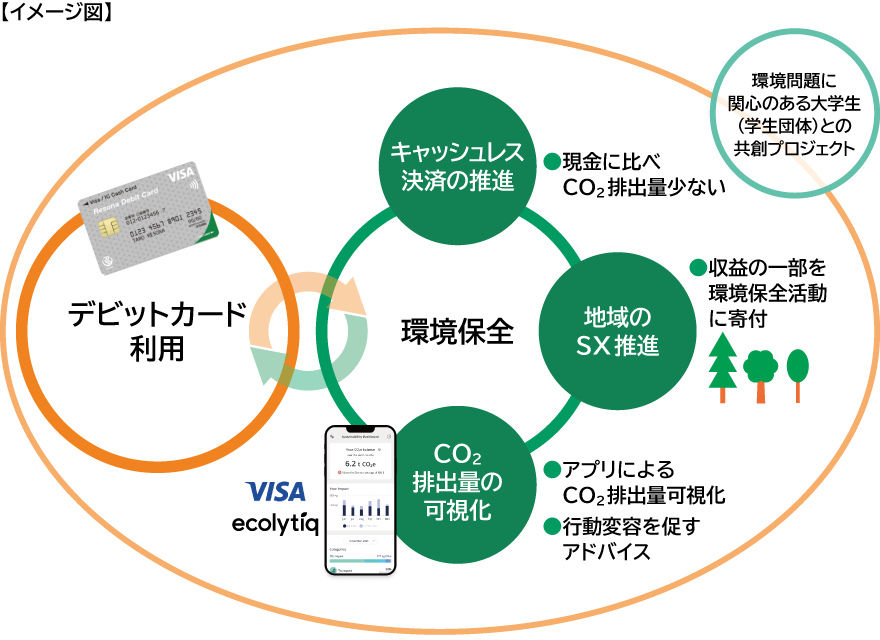 環境問題に関心のある大学生(学生団体)と共創プロジェクトを2025年9月に立ち上げ、デビットカードの利用推進活動や環境問題をテーマにしたアイデアコンテストなどを開催します。学生の柔軟な発想・発信力を取り入れるとともに、若年層の金融・環境リテラシーの向上を後押し、持続可能な社会の実現を目指します。