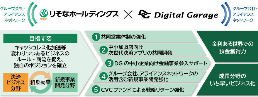 株式会社りそなホールディングス(取締役兼代表執行役社長兼グループCEO 南 昌宏)は、本日開催の取締役会において、下記のとおり、株式会社デジタルガレージ(代表取締役兼社長執行役員グループCEO 林 郁、以下「DG」)の普通株式の追加取得(以下「本株式取得」)により、DGを持分法適用関連会社とすること、また、それに伴い決済ビジネス分野と新規事業開発分野における提携の強化・深化に向けて、新たな資本業務提携(以下「本資本業務提携」)に係る契約(以下「本資本業務提携契約」)を締結することについて決議しましたので、お知らせします。