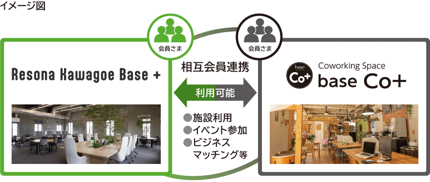 - ※1「Resona Kawagoe Base+」は月額一般会員とインキュベーション会員、「コワーキングスペースbase Co+ SHIKI」はウィークデー会員・マスター会員・プラチナ会員が対象