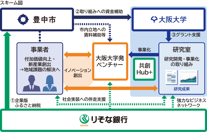 企業版ふるさと納税を活用し、2026年~2032年にかけて最大10億円を豊中市へ寄付します。寄付金は、豊中市から大阪大学の研究成果による社会実装支援の取り組みなどに対して拠出されます。これにより大阪大学では、事業化を目指す研究シーズを有する研究者に対し、グラント※2支援を行います。