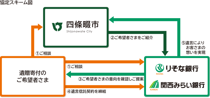 りそなグループのりそな銀行(社長 岩永 省一)と関西みらい銀行(社長 西山 和宏)は、円滑な遺贈寄付※を実現するため、四條畷市と「遺言信託を活用した遺贈寄付に関する協定」を本日、締結しました。