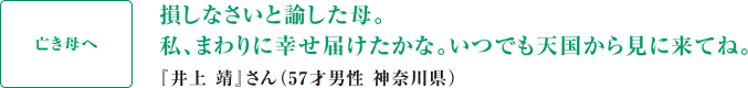 亡き母は、社会人になったら、自分が一番損な役回りをしなさいと私に諭していました。十数年後、部下を持つ立場になって、心から本質をつく言葉だと分かり、努めて損をするように行動しました。そして、そのことは退職後の人生にさえ、大いに影響を与えています。そんな今の私を天国から見に来て欲しいです。その時、「お母さん、私、損をしたかな」と聞きます。